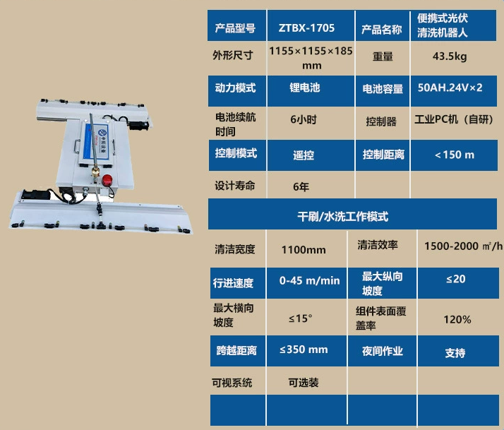 產品特點:干洗水洗一體,遙控操作,尼龍雙刷,單人單機一天可以清洗2到3兆瓦